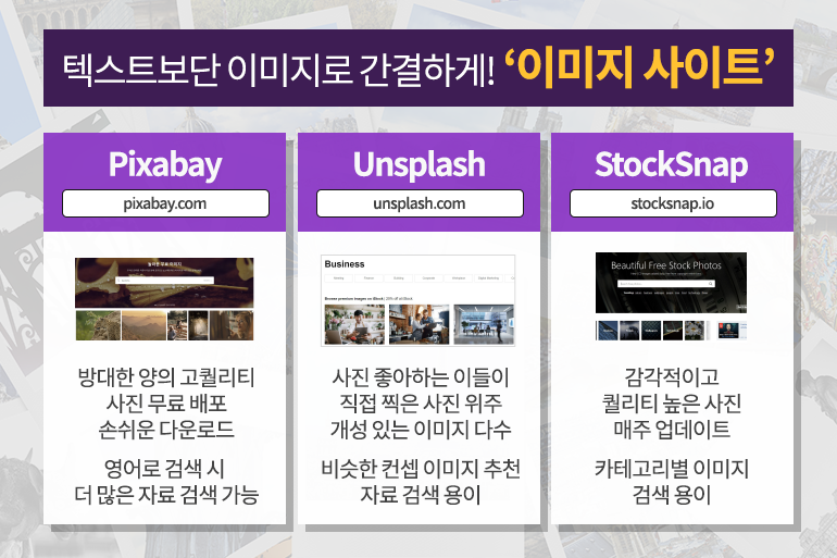 흔하지 않은 이미지로 개성을 드러내고 싶다면 사진을 좋아하는 이들이 직접 촬영한 자료를 공유하는 ‘Unsplash’ 사이트(링크)를 추천해요. 자료 검색이 용이한 것은 물론 검색한 자료와 비슷한 컨셉의 이미지를 추천해주어 적절한 이미지를 찾기가 더욱 쉽죠. 고퀄리티 사진이 매주 업데이트 되는 ‘StockSnap’ 사이트(링크) 역시 카테고리별로 이미지를 검색하기 쉽고, 요즘 인기있는 이미지도 한눈에 확인할 수 있어 감각적인 PPT를 만드는 데 많은 도움이 될 거예요.