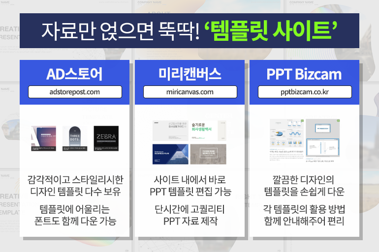 감각적이고, 스타일리시한 디자인의 PPT를 만들고 싶다면 ‘AD스토어’ 사이트(링크)가 유용하죠. 각 템플릿에 어울리는 폰트도 함께 다운받을 수 있어 활용도가 더욱 높답니다. 급하게 발표 자료를 만들어야 한다면 ‘미리캔버스’ 사이트(링크)를 추천하는데요. 사이트 내에서 즉시 PPT 템플릿 편집이 가능해 단시간에 고퀄리티 PPT 자료를 완성할 수 있어. ‘PPT Bizcam’ 사이트(링크)에서는 깔끔한 디자인의 템플릿을 손쉽게 다운받을 수 있으며, 각 템플릿의 활용 방법도 함께 안내해주어 더욱 편리해요.