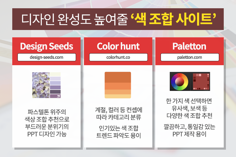 ‘Design Seeds’ 사이트(링크)에서 추천하는 색상 조합표를 참고하는 것도 좋은 방법인데요. 파스텔톤 위주의 색상들을 보여주어 부드러운 색감이 필요할 때 활용하면 효과적이죠. ‘Color hunt’ 사이트(링크)에서는 계절, 컬러 등 컨셉에 따른 색상 조합이 카테고리별로 분류되어 있으며, 인기있는 색 조합 트렌드도 파악할 수 있어 유용해요. 한 가지 색을 선택하면 유사색, 보색 등 다양한 색 조합을 추천해주는 ‘Paletton’ 사이트(링크)를 활용하면 깔끔하고, 통일감 있는 PPT를 만들 수 있답니다. 각 사이트에서 찾은 컬러는 PPT에서 ‘스포이드’로 추출하면 동일하게 색을 구현할 수 있으니 참고해 주세요.