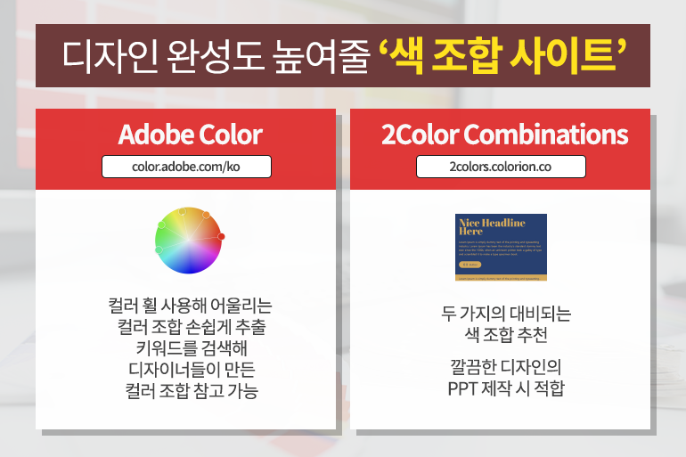 PPT를 깔끔하고, 예쁘게 디자인하기 위해선 적절한 색을 조합하는 것이 중요한데요. 하지만 디자인에 조예가 깊은 분들이 아니라면 적절한 색상 조합을 찾는 것이 쉽지 않아요. 그럴 땐 ‘Adobe Color’ 사이트(링크)에서 컬러 휠을 사용하면 어울리는 컬러톤을 손쉽게 추출해낼 수 있어요. 또한 키워드를 검색하면 디자이너들이 만든 트렌디한 컬러 조합도 참고할 수 있죠. 2가지의 대비되는 색 조합을 간결하게 보여주는 ‘2 Color Combinations’ 사이트(링크)는 깔끔한 PPT 제작에 도움이 돼요.