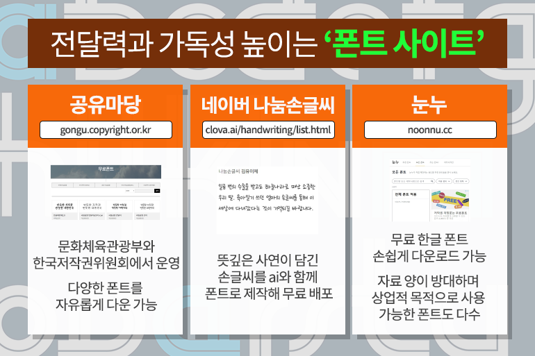 ‘네이버 나눔손글씨’ 사이트(링크)에서는에서는 뜻깊은 사연이 담긴 손글씨를 ai와 함께 폰트로 제작해 무료 배포하고 있어요. ‘눈누’ 사이트(링크)는 무료 한글 폰트를 손쉽게 다운로드 할 수 있는 사이트로 자료 양이 방대한 것은 물론, 상업적 목적으로 사용 가능한 폰트가 많아 활용도가 매우 높답니다.