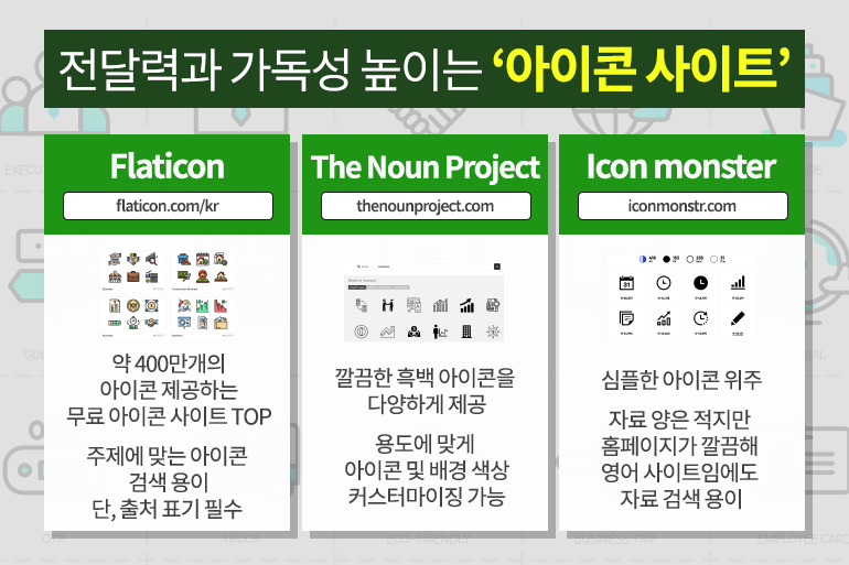 ‘The Noun Project’ 사이트(링크)에서는 흑백의 깔끔한 아이콘을 다양하게 제공하는데요. 아이콘이나 배경 색상을 용도에 맞게 커스터마이징 할 수 있다는 것이 큰 장점이랍니다. 심플한 아이콘을 위주로 찾는다면 ‘Icon monster’ 사이트(링크) 유용해요. 자료의 양은 적지만 홈페이지가 깔끔하게 꾸며져 영어 사이트임에도 자료를 검색하기 매우 쉽죠.