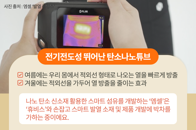 국내 기업 ‘엠셀’은 나노탄소 신소재 코팅 기술을 활용해 의류와 생활 가전, 전기자동차 등에 적용이 가능한 첨단 고효율의 스마트 섬유를 개발하고 있는데요. 최근에는 휴비스와 함께 손을 잡고, 스마트 발열 소재와 전기자동차용 스마트 섬유 개발 및 양산화에 더욱 박차를 가하고 있다고 하니 앞으로 스마트 섬유 시장에서 어떠한 혁신을 주도할지 기대해 주세요.