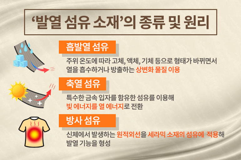 이외에도 주위 온도에 따라 고체, 액체, 기체 등으로 형태가 바뀌면서 열을 흡수하거나 방출하는상변화물질을 이용한 ‘흡발열 섬유’와 특수한 금속 입자를 함유한 섬유를 이용해 빛 에너지를 열 에너지로 전환하는 ‘축열 섬유’, 신체에서 발생하는 원적외선을 세라믹 소재의 섬유에 적용해 발열 기능을 형성하는 ‘방사 섬유’ 등이 발열 의류 소재로 주로 사용되고 있답니다.