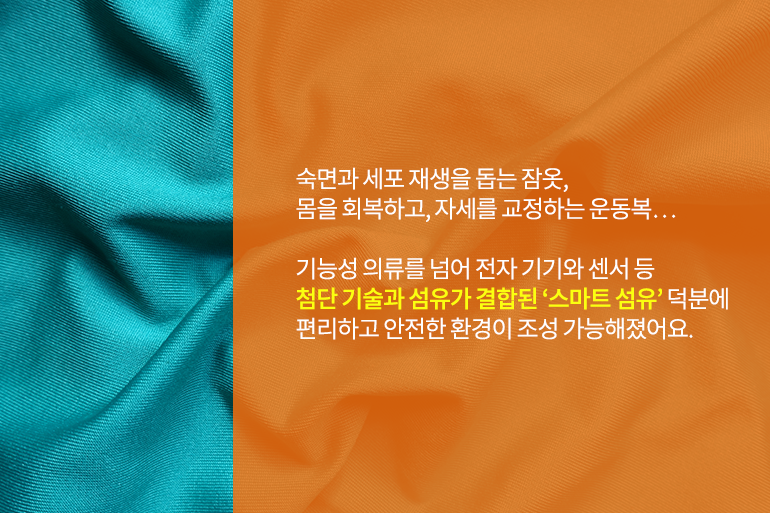 방한, 방수, 자외선 차단 등의 기능성 섬유를 넘어 이제는 전자 기기와 센서 등 첨단 기술과 섬유가 결합된 ‘스마트 섬유’의 세상이 열리고 있죠. 쾌적성, 안정성, 내구성, 심미성, 편의성 등 의복 본연의 역할에 충실하면서도 통신, 제어, 저장, 신호처리 등 스마트한 기능이 더해진 것을 ‘스마트 섬유’라 지칭하는데요. 옷뿐 아니라 신발, 자동차, 침대 등 모든 일상 곳곳에서 접하는 섬유에 첨단 IT 기기를 접목함으로써 생활 패턴을 정확하게 분석할 수 있으며, 편리하고 안전한 환경을 조성하는 데 많은 도움이 된답니다.