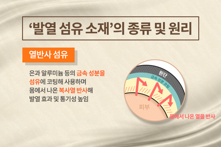 여기서 한 단계 더 발전한 발열 의류 소재는 몸에서 나오는 복사열을 반사해 따뜻하게 만드는 ‘열반사 섬유’예요. 겨울 패딩 안쪽에 은박지처럼 번쩍이는 소재가 사용된 경우를 흔히 볼 수 있는데요. 이 소재는 은과 알루미늄 등의 금속 성분을 섬유에 코팅하거나 도금해 주로 사용하며 몸에서 나온 열을 반사해 발열 효과를 높이고, 통기성이 뛰어나 쾌적하게 옷을 입을 수 있죠.