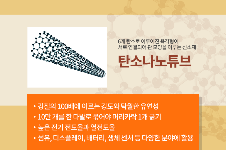 이러한 스마트 섬유를 만드는 핵심 소재인 ‘탄소나노튜브’는 6개의 탄소로 이루어진 육각형이 서로 연결되어 관 모양을 이루는 신소재인데요. 매우 가늘어서 10만 개를 한 다발로 묶어야 머리카락 1개 굵기가 될 정도라고 해요. 하지만 강철의 100배에 이르는 강도와 유연성, 높은 전기 전도율과 열전도율을 가져 섬유, 디스플레이, 배터리, 생체 센서 등 다양한 분야에 활용되고 있답니다.