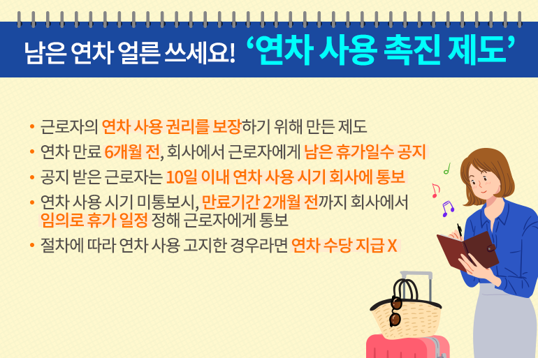 여기서 ‘연차사용촉진제도’란 근로자의 연차 사용권리를 보장하기 위해 마련된 제도로, 연차가 만료되기 6개월 전에 회사에서 근로자에게 남은 휴가일수를 공지하는 거예요. 공지를 받은 근로자는 10일 이내 회사에 연차 사용 시기를 통보해야 하지만, 만약 연차 사용 시기를 통보하지 않을 경우 만료 기간 2개월 전까지 회사에서 임의로 휴가 일정을 정해 근로자에게 통보하게 된답니다. 절차에 따라 회사에서 연차 사용을 고지했음에도 근로자가 연차를 사용하지 않으면 미사용 연차는 소멸되고, 연차수당과 같은 금전적인 보상을 받을 수도 없죠.
