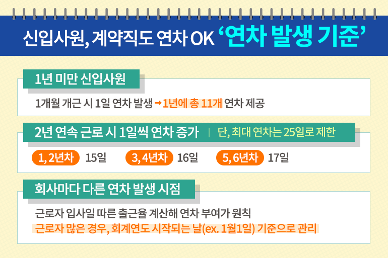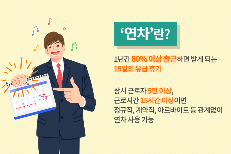 주말의 휴식은 빡빡하고, 힘든 회사 생활을 견딜 수 있는 원동력이 되죠. 하지만 ‘토, 일’이 아닌 ‘퇼’로 불릴 만큼 빠르게 흘러가는 주말은 항상 아쉽기만 해요. 짧은 주말만으로는 휴식이 부족한 직장인들을 위해 마련된 제도가 바로 ‘연차’ 예요. 어느덧 연말이 되면서 나에게 남은 연차는 얼마나 되는지, 미처 사용하지 못한 연차는 언제까지 쓸 수 있는지 등에 대한 궁금증이 생기실 텐데요. 오늘은 연차 발생 및 소멸 기준부터 연차 수당까지, 연차에 관한 모든 것을 함께 알아보아요!