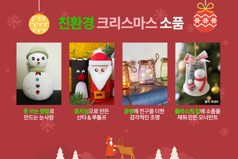 어느덧 곳곳에서 크리스마스 장식들이 반짝이고, 캐럴이 흘러나오는 걸 보며 크리스마스가 코앞에 왔음을 실감하게 되는데요. 크리스마스는 모두가 행복하고, 즐거운 날이지만 지구에게 있어서 만큼은 그리 달갑지 않은 날이에요. 각종 크리스마스 장식품, 과도한 선물 포장, 엄청난 양의 음식물 등 크리스마스로 인해 대량의 쓰레기가 발생하기 때문이죠. 올해는 마스크와 일회용품 사용이 급증해 환경오염 문제가 심각한만큼 환경을 생각하는 크리스마스를 보낸다면 더욱 의미가 있을 텐데요. 그렇다면 친환경 크리스마스를 보낼 수 있는 방법은 무엇이 있을까요?