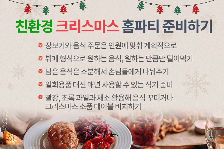 또한 파티 분위기를 위해 무분별하게 사용되는 일회용품도 줄일 수 있다면 더욱 좋겠죠! 크리스마스 시즌마다 꾸준히 사용할 수 있는 예쁜 식기류를 준비하면 매년 발생하는 엄청난 양의 일회용품을 줄일 수 있어요. 일반 식기를 사용하더라도 빨간색, 초록색의 과일, 채소 등을 요리 장식으로 활용하거나 테이블 위에 소품을 비치하는 것만으로도 크리스마스 분위기를 충분히 낼 수 있답니다.