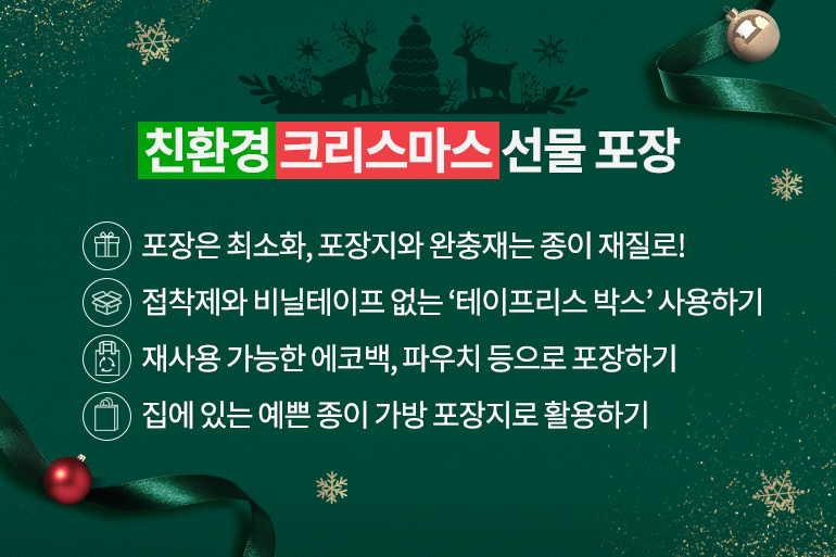 어느덧 곳곳에서 크리스마스 장식들이 반짝이고, 캐럴이 흘러나오는 걸 보며 크리스마스가 코앞에 왔음을 실감하게 되는데요. 크리스마스는 모두가 행복하고, 즐거운 날이지만 지구에게 있어서 만큼은 그리 달갑지 않은 날이에요. 각종 크리스마스 장식품, 과도한 선물 포장, 엄청난 양의 음식물 등 크리스마스로 인해 대량의 쓰레기가 발생하기 때문이죠. 올해는 마스크와 일회용품 사용이 급증해 환경오염 문제가 심각한만큼 환경을 생각하는 크리스마스를 보낸다면 더욱 의미가 있을 텐데요. 그렇다면 친환경 크리스마스를 보낼 수 있는 방법은 무엇이 있을까요?