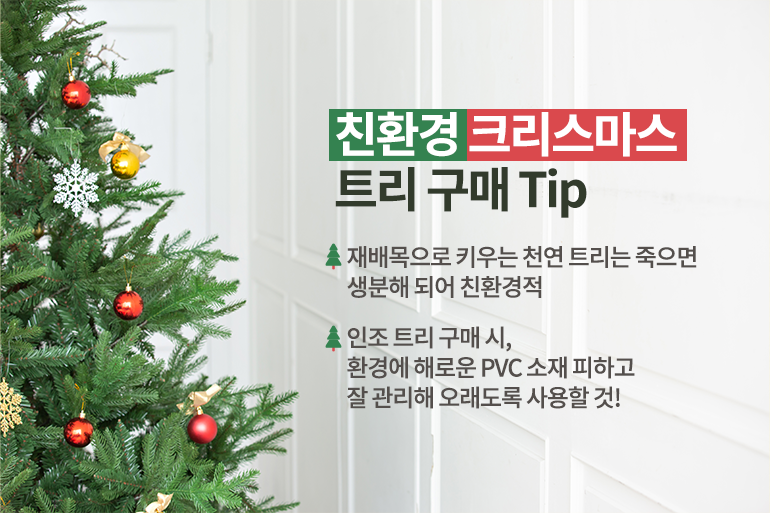크리스마스 분위기를 느끼기 위해선 크리스마스 트리와 각종 장식들이 빠질 수 없는데요. 농작물처럼 재배목으로 키우는 ‘천연 트리’를 사용하면 죽은 후 생분해되기 때문에 환경 파괴 걱정이 적어요. ‘인조 트리’ 구매 시에는 환경에 해로운 PVC 소재를 피하고, 잘 관리해 오래도록 사용하면 환경오염 걱정을 줄일 수 있죠.