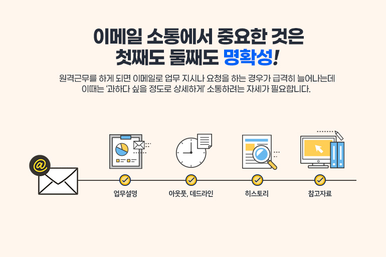 원격근무를 하게 되면 이메일로 업무 지시나 요청을 하는 경우가 급격히 늘어나는데 이때는 ‘과하다 싶을 정도로 상세하게’ 소통하려는 자세가 필요합니다. 서로의 업무 상황이 눈에 보이지 않기 때문에 사무실 근무보다는 공유되는 맥락이 적기 때문이죠. 그래서 요청한 사람이 가지고 있는 정보와 요청 받는 사람이 가지고 있는 정보의 격차가 훨씬 커질 수가 있습니다.