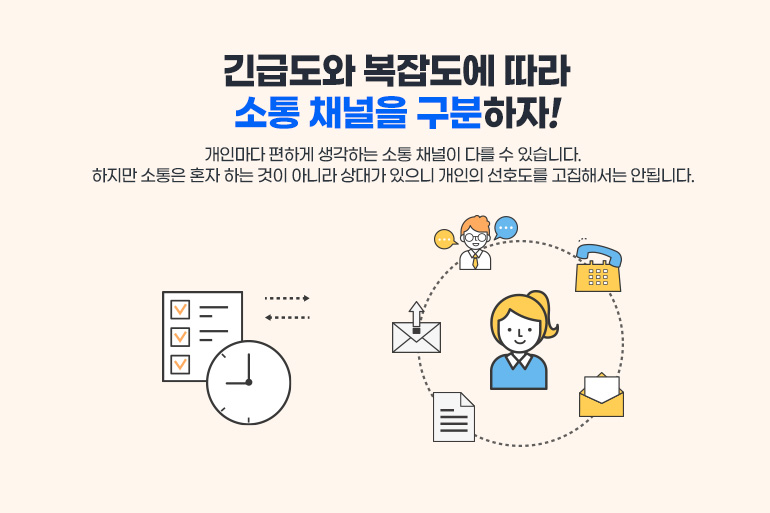 누구는 이메일을 선호하고 누구는 전화를 선호하고 개인마다 편하게 생각하는 소통 채널이 다를 수 있습니다. 하지만 소통은 혼자 하는 것이 아니라 상대가 있으니 개인의 선호도를 고집해서는 안됩니다. 그보다는 어떤 상황에서 어떤 채널이 가장 효율적이고, 효과적인지를 따지는 것이 더 필요합니다.