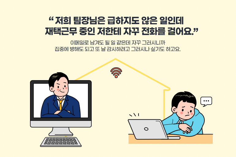 팀원: “저희 팀장님은 급하지도 않은 일인데 재택근무 중인 저한테 자꾸 전화를 걸어요. 이메일로 남겨도 될 일 같은데 자꾸 그러시니까 집중에 방해도 되고 또 날 감시하려고 그러시나 싶기도 하고요.”