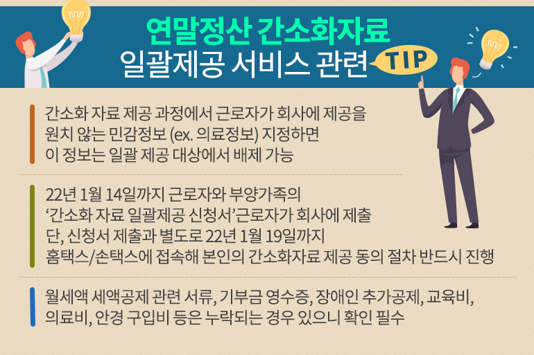 ‘연말정산 간소화 자료 일괄제공 서비스’를 이용하기 위해서는 22년 1월 14일까지 근로자와 부양가족의 ‘간소화 자료 일괄제공 신청서’를 근로자가 회사에 제출하면 되는데요. 단, 신청서 제출과는 별도로 22년 1월 19일까지 홈택스 또는 손택스에 접속해 본인의 간소화자료 제공 동의 절차를 반드시 진행해야 한답니다. (* 일괄제공 대상자로 등록한 근로자는 홈택스/손택스 접속 시 일괄제공 확인 화면으로 자동 안내)