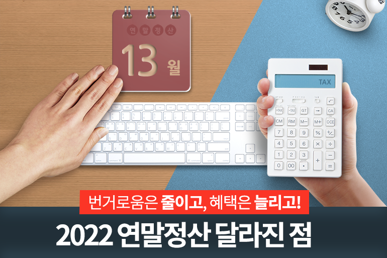 한 해를 마무리하는 이 시기가 되면 연말정산에 대한 직장인들의 관심이 높아지죠. ‘13일의 월급’으로 쏠쏠한 기쁨을 줄 수도 있지만, 오히려 세금 부담으로 돌아올 수 있어 꼼꼼하게 알아보고 준비해야 하는데요. 하지만 매년 하는 연말정산임에도 할 때마다 어렵고, 번거롭다는 생각을 지울 수가 없어요. 그래도 올해는 번거로운 과정을 줄이고, 공제 혜택은 늘어난다는 소식이 들리면서 연말정산에 대한 기대감이 조금은 커지고 있는데요. 그렇다면, 2022년 연말정산부터 새롭게 달라진 점을 자세히 살펴볼까요?
