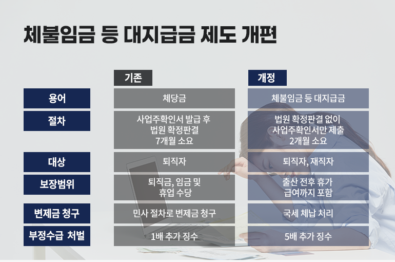 기존에는 퇴직자에게만 대지급금 제도를 적용했으나 올해부터는 재직자까지 확대 적용되어 재직 중에 임금 체불이 발생해도 대지급금을 청구할 수 있게 되었어요. 다만 저소득 근로자를 우선으로 하고, 단계적으로 확대해 나갈 예정이에요. 또한 퇴직금, 임금 및 휴업 수당만 보장하던 현행법과 달리 앞으로는 출산 전후 휴가 급여까지 포함되었죠. 즉, 재직중 임신 및 출산을 한 경우 더 많은 대지급금을 받게 되는 거예요. 마지막으로 민사 절차로 진행되던 변제금(국가가 사업주 대신 체불임금 지급 후 사업주에게 청구하는 금액) 청구를 국세 체납으로 변경해 회수율을 높이고, 부정수급을 한 경우 추가징수금을 최대 5배까지 인상할 예정이랍니다.