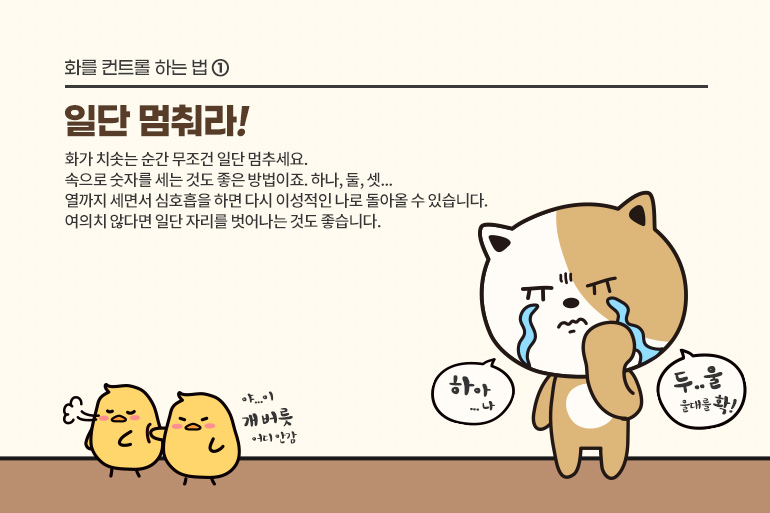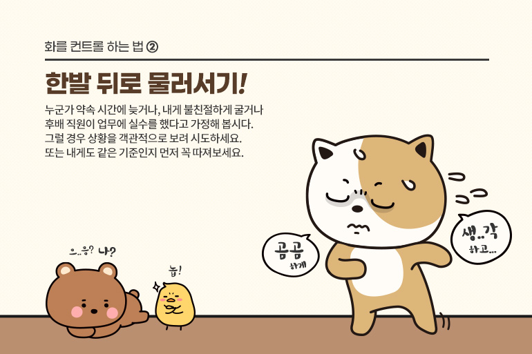 치열한 직장 생활 속에서는 누구나 화를 참을 수 없는 포인트가 있습니다. 화가 치솟는 순간 무조건 일단 멈추세요. 속으로 숫자를 세는 것도 좋은 방법이죠. 화나는 대로 마구 말했다가는 후회하기 십상이거든요. 하나, 둘, 셋... 열까지 세면서 심호흡을 하면 다시 이성적인 나로 돌아올 수 있습니다. 여의치 않다면 일단 자리를 벗어나는 것도 좋습니다. 화장실에 가서 손을 씻거나 일부러 밖에 나가 음료수를 한 잔 마시는 것도 프로다운 평정심을 유지할 수 있는 방법입니다.