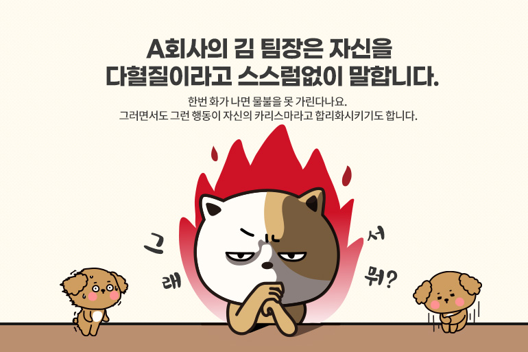 A회사의 김 팀장은 자신을 가리켜 다혈질이라고 스스럼없이 말합니다. 한번 화가 나면 물불을 못 가린다나요. ‘난 원래 그래’라는 말을 추임새처럼 넣는 것도 잊지 않습니다. 직장에서 거슬리는 일이 있으면 누구에게나 바로 화를 냅니다. 그러면서도 그런 행동이 자신의 카리스마라고 합리화시키기도 합니다.