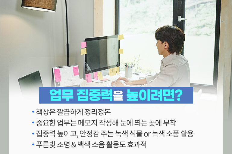집중력은 주위 환경에 특히나 많은 영향을 받기 때문에 집중력을 높일 수 있는 업무 환경을 만드는 것이 중요해요. 책상 위에 널부러진 물건들을 깔끔하게 정리해 산만함을 줄이고, 중요한 업무는 메모지에 일목요연하게 작성해 눈에 띄는 곳에 붙여 두면 집중력 향상에 도움이 되죠. 집중력을 높이고, 마음을 안정시키는 녹색 식물을 책상에 두는 것도 효과적인데요. 식물을 두고, 관리하기가 어렵다면 녹색 계열 소품을 활용해 보는 것도 좋겠네요.