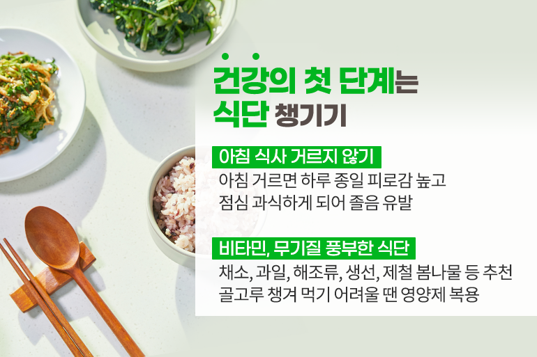 춘곤증의 원인 중 하나가 영양소 부족 및 영양의 불균형인 만큼 규칙적으로 균형 잡힌 식사를 하면 많은 도움이 되는데요. 특히 아침 식사를 잘 챙겨 먹는 것이 매우 중요해요. 아침을 거르면 뇌에서 필요한 탄수화물을 공급받지 못하고, 배가 고픈 상태로 오전을 보내 점심을 과식하게 되면서 춘곤증이 심해질 수 있기 때문이죠. 또한 오전 시간은 신체적, 정신적인 활동이 가장 많기 때문에 적절한 영양 공급이 되지 않으면 하루종일 피로감을 벗어나기가 어렵답니다.