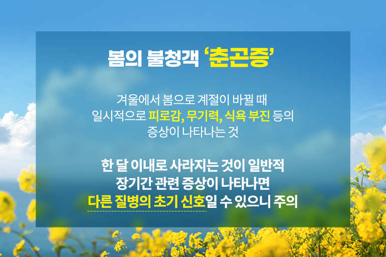 야외 활동이 늘어남에 따라 비타민, 단백질, 무기질 등의 영양소 소모가 증가하지만 이를 충분히 섭취하지 못해 영양 불균형이 일어날 때도 춘곤증 증상이 나타날 수 있어요. 춘곤증은 질병으로 분류되지 않으며, 한 달 이내로 증상이 사라지는 것이 일반적인데요. 만약 장기간 관련 증상이 나타난다면 갑상선 기능 저하증, 결핵, 우울증, 당뇨병 등 다른 질병의 초기 신호일 수 있으니 반드시 병원에 방문해 진단을 받아 보는 것을 권장해요.