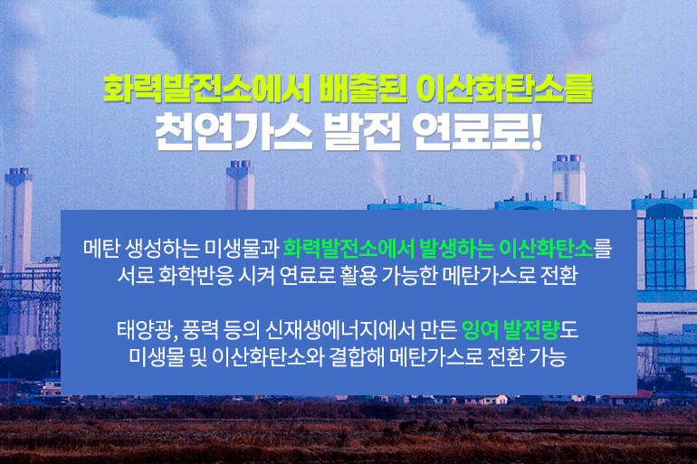 국내에서는 석탄화력발전소에서 배출된 이산화탄소를 석탄화력의 대안이 될 수 있는 천연가스의 발전 연료로 만드는 기술을 연구하고 있어요. 메탄을 생성하는 미생물과 화력발전소에서 발생하는 이산화탄소를 서로 화학반응 시켜 연료로 활용 가능한 메탄가스로 전환하는 방식이죠. 이 기술이 확보된다면 태양광, 풍력 등의 신재생에너지에서 만든 잉여 발전량도 미생물 및 이산화탄소와 결합해 메탄가스로 전환이 가능한데요. 날씨에 따라 변하는 풍력, 태양광 발전을 안정적으로 유지할 수 있어 많은 도움이 될 거예요.