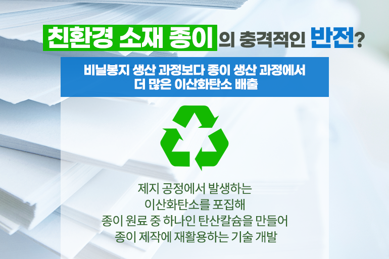 우리가 친환경 소재라고 생각했던 종이의 생산 과정에서 비닐봉지보다 더 많은 이산화탄소가 배출된다는 사실, 알고 계셨나요? 이러한 문제를 해결하기 위해 종이를 만들 때 발생하는 이산화탄소를 다시 종이 제작에 활용하는 기술이 각광받고 있어요. 제지 공정에서 발생하는 이산화탄소를 포집한 뒤, 종이의 원료 중 하나인 탄산칼슘을 만들어 종이 제작에 재활용하는 거죠. 실제로 2018 평창 동계올림픽 당시 이산화탄소로 만든 친환경 고급 인쇄용지가 사용되어 좋은 평가를 얻기도 했답니다.