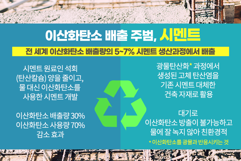 이산화탄소를 광물과 반응시키는 ‘광물탄산화’ 과정에서 생성된 고체 탄산염을 기존 시멘트를 대체한 건축 자재로 활용할 수도 있는데요. 이렇게 생성된 탄산염은 대기로 이산화탄소 방출이 불가능하고, 물에 잘 녹지 않아 환경에 무해하죠. 국내 건설 업계, 정유 업계에서도 이산화탄소를 시멘트의 원재료인 탄산칼슘으로 바꿀 수 있는 시설을 확충하며 탄소중립에 적극적으로 동참하고 있답니다.