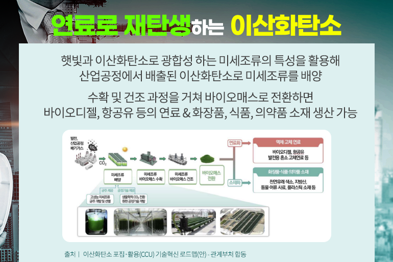 식물성 플랑크톤이라 불리는 미세조류는 석유계 원료를 대체할 수 있는 경우가 많아 친환경 소재로 원료로 주목받고 있는데요. 일반 식물과 마찬가지로 햇빛과 이산화탄소를 통해 광합성을 하며 유기물을 생산하는 것이 미세조류의 특징이죠. 이러한 미세조류의 특성을 활용하면 화석연료를 태우면서 발생한 이산화탄소를 다시 연료로 만들 수 있어요. 산업공정에서 배출된 이산화탄소로 미세조류를 배양한 후, 수확 및 건조 과정을 거쳐 바이오매스(화학적 에너지로 이용되는 생물)로 전환하면 바이오디젤, 항공유 등의 연료 생성이 가능하죠. 연료뿐 아니라 지방산, 색소, 동물사료 등을 만들어 화장품, 식품, 의약품 소재로도 활용할 수 있답니다.
