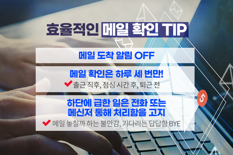 메일 도착 알림은 꺼 두고, 하루에 세 번 나누어 메일을 확인하는 걸 추천하는데요. 우선 출근 직후 메일을 확인하고, 하루 업무 스케줄을 정리해요. 그리고 점심 시간 후에 오전 시간 동안 쌓였던 메일을 처리하고, 퇴근 전에 메일함을 한 번 더 체크하면 충분하죠. 메일을 보낼 때는 하단에 연락처를 기재하고, 급한 일은 전화 연락 혹은 메신저를 통해 처리하고 있음을 고지하는 것도 좋은 방법이에요. 이렇게 하면 중요한 메일을 놓칠까 하는 불안감을 줄일 수 있고, 상대방도 이메일 답변을 기다리느라 답답해하지 않을 거예요.