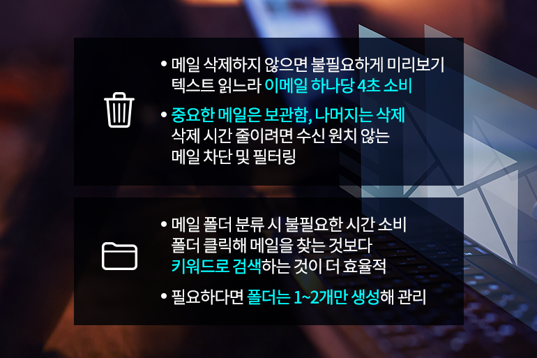 메일을 삭제하는 시간을 줄이려면 수신을 원하지 않는 메일은 수신 동의를 취소하고, 스팸 차단 및 필터링 기능 등을 활용하는 것도 도움이 돼요. 또한 깔끔하고, 편리하게 메일을 관리하겠다는 생각에 메일함 폴더를 세분화하는 분들도 계실 텐데요. 이런 경우 폴더를 만들고, 메일을 일일이 분류하느라 불필요하게 시간을 소비해야 하죠. 시간이 지나 다시 메일을 확인해야 할 때는 검색 기능을 활용하는 것이 시간 절약에 훨씬 도움이 되는데요. 실제로 폴더를 클릭해 메일을 찾는 것보다 키워드로 검색하는 것이 약 9%는 빠르다는 통계도 있답니다.