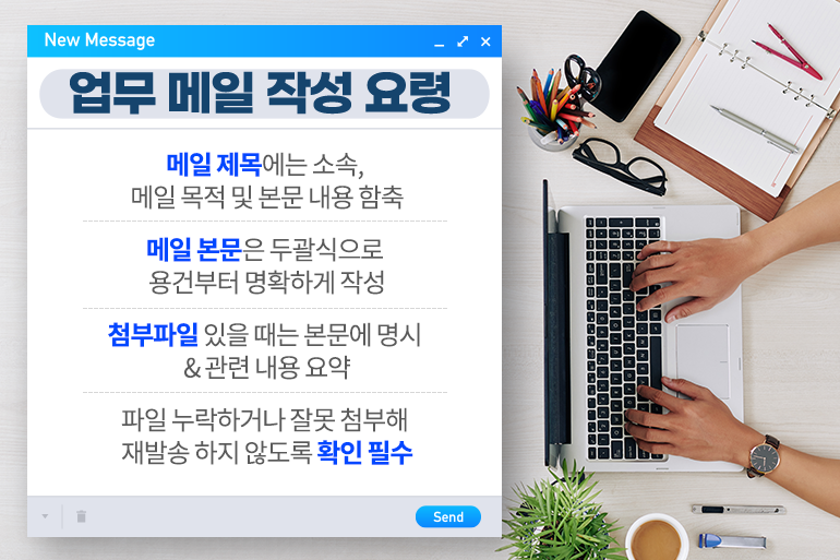 또한 첨부파일이 있을 때는 본문에 첨부 파일이 있음을 명시하고, 첨부파일 분량이 방대한 경우 관련 내용을 요약해서 본문에 적어주세요. 파일이 누락되거나 잘못 첨부해 다시 메일을 보내느라 시간을 허비하지 않도록 꼼꼼한 확인은 필수죠. 전달할 내용이 많을 때는 1), 2), 3) 번호를 매겨 소제목을 쓰거나 볼드체로 핵심 내용을 한 눈에 파악할 수 있게 해주는 것도 좋은 방법인데요. 만약 긴 설명이 필요하거나 여러 차례 메일을 주고받아야 하는 사안이라면 미팅을 소집하거나 전화 통화로 대체하는 것이 훨씬 효율적일 수 있답니다.