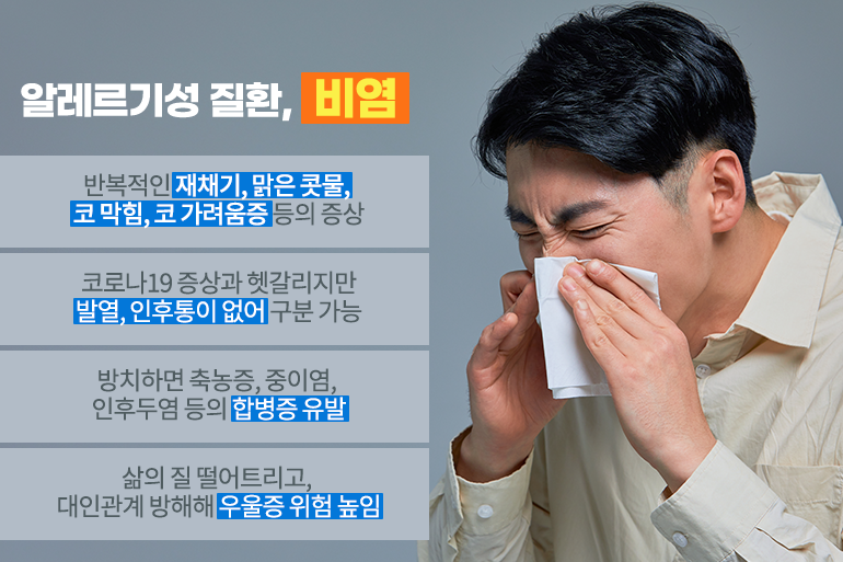 알레르기성 비염의 대표적인 증상은 반복적인 재채기, 맑은 콧물, 코 막힘, 코 가려움증 등으로 코로나19와 일부 증상이 비슷해 헷갈리는 경우가 많아요. 하지만 알레르기성 비염의 경우 발열이나 인후통이 없으니 증상을 구분하는 것이 크게 어렵지는 않을 거예요. 알레르기성 비염 증상이 지속되면 축농증, 중이염, 인후두염 등의 합병증이 생길 수 있어 발병 초기에 병원을 찾아 적절한 치료를 받는 것을 추천해요. 알레르기성 비염의 경우 삶의 질을 떨어트리고, 대인관계까지 방해해 우울증의 위험까지 높인다고 하니 비염을 유발하는 환경을 개선하는 데 특히 신경을 써 주세요.