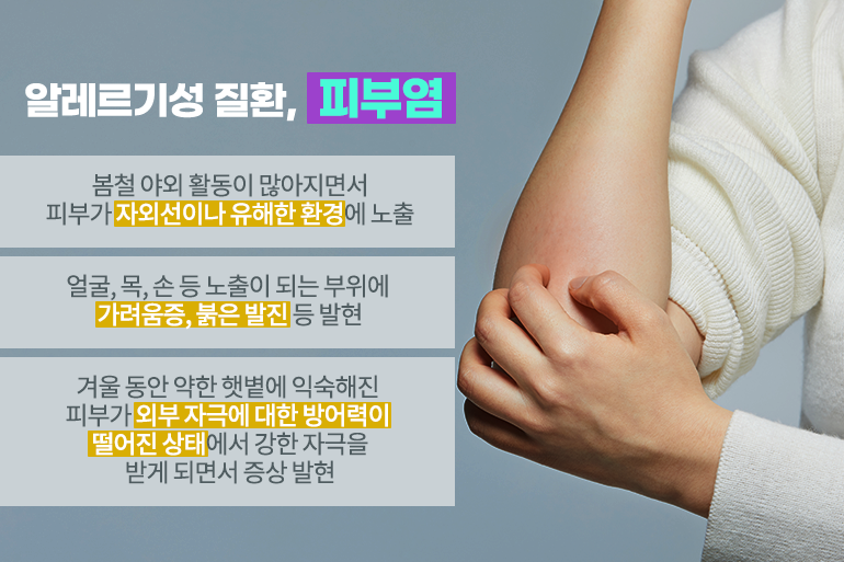 봄이 되어 야외 활동이 많아지면서 피부가 자외선이나 유해한 환경에 노출될 가능성도 더욱 커지죠. 이로 인해 알레르기성 피부염이 발병하면 얼굴, 목, 손 등 노출이 되는 부위에 가려움증, 붉은 발진 등이 일어나는 경우가 빈번해요. 겨울 동안 약한 햇볕에 익숙해진 피부가 외부 자극에 대한 방어 능력이 떨어진 상태에서 강한 자극을 받기 때문에 이러한 증상이 발현되는 건데요. 피부를 청결하게 유지하고, 건조해진 피부 보습에 신경을 쓰면 알레르기성 피부염을 완화시키는 데 큰 도움이 된답니다.