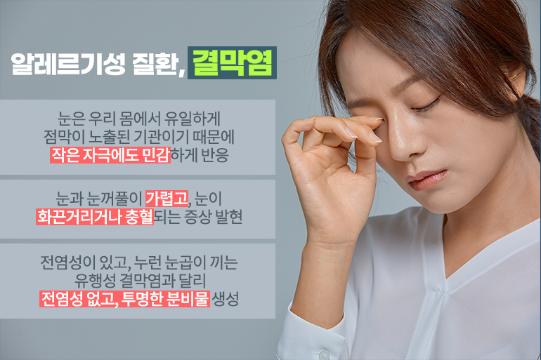 눈은 우리 몸에서 유일하게 점막이 노출된 기관이기 때문에 작은 자극에도 민감하게 반응하는데요. 건조해진 결막에 염증을 일으키는 이물질이 닿으면 알레르기성 결막염을 유발할 수 있죠. 만약 눈과 눈꺼풀이 가렵고, 눈이 화끈거리거나 충혈되면 알레르기성 결막염을 의심해볼 수 있어요. ‘눈병’으로 불리는 유행성 결막염과 달리 전염성이 없고, 유행성 결막염은 누런 눈곱이 끼지만 알레르기성 결막염은 투명한 분비물이 생기는 경우가 많아요. 눈을 비비게 되면 증상이 악화되기 때문에 절대 눈을 비비지 않고, 적절한 치료를 받는 것이 중요하죠.