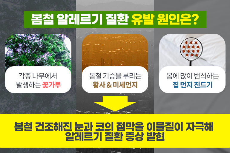봄철 건조한 날씨 탓에 눈과 코가 건조해진 상태에서 이물질이 점막을 자극하면 알레르기 질환의 증상이 나타나게 돼요. 알레르기성 질환을 유발하는 원인은 매우 다양한데요. 가장 대표적인 원인은 각종 나무에서 발생하는 꽃가루예요. 바람을 타고 꽃가루가 멀리 날아가는 자작나무, 오리나무, 참나무 등이 알레르기를 유발하는 대표적인 나무에 속하죠. 건조한 봄에 유독 기승을 부리는 황사와 미세먼지도 봄철 알레르기 질환을 일으키는 주요 원인 중 하나예요. 황사나 미세먼지의 작은 입자는 여과되지 않고 호흡기에 직접적으로 영향을 주기 때문에 더욱 위험하죠.