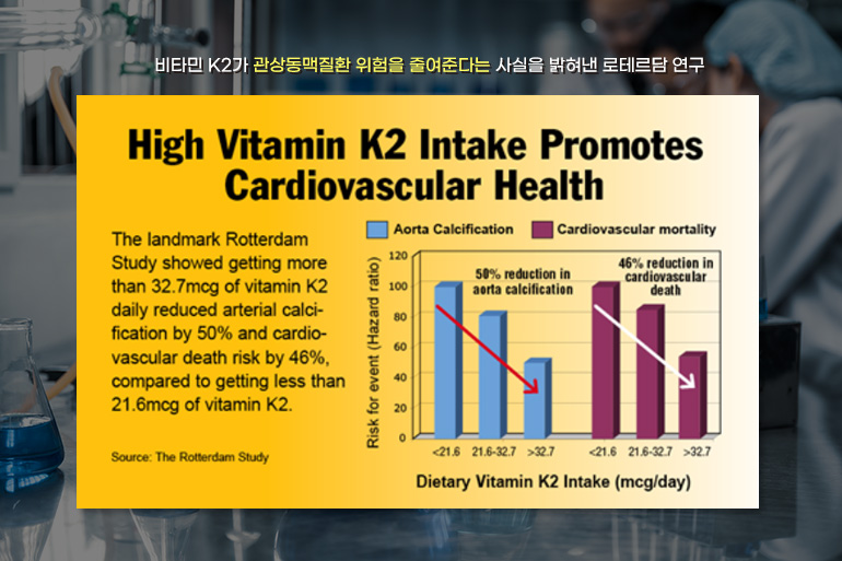 비타민 K2에 대한 네덜란드의 노테르담 연구 결과를 소개해 드리겠습니다. 네덜란드 사람 약 4천 8백여명을 대상으로 8~11년간 비타민 K2를 꾸준히 섭취했을 때 관상 동맥에 칼슘이 침착될 위험률이 50%까지 감소하고, 심혈관 질환 사망률은 50%까지 감소했다는 연구결과가 있습니다. 일반인 기준으로 하루에 50~100ug정도의 비타민 K2를 섭취하면 좋으며, 완경기 여성인 경우에는 하루 150ug정도까지 먹어도 좋습니다.