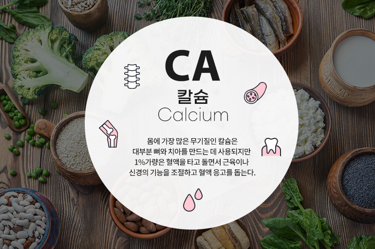'칼슘'은 뼈와 치아의 구성 요소이자 근육과 신경의 기능 조절, 혈액 응고에 도움을 주는 영양소입니다. 99%는 뼈와 치아에 존재하며 나머지 1%는 혈액, 세포외액, 근육 등에 있습니다.