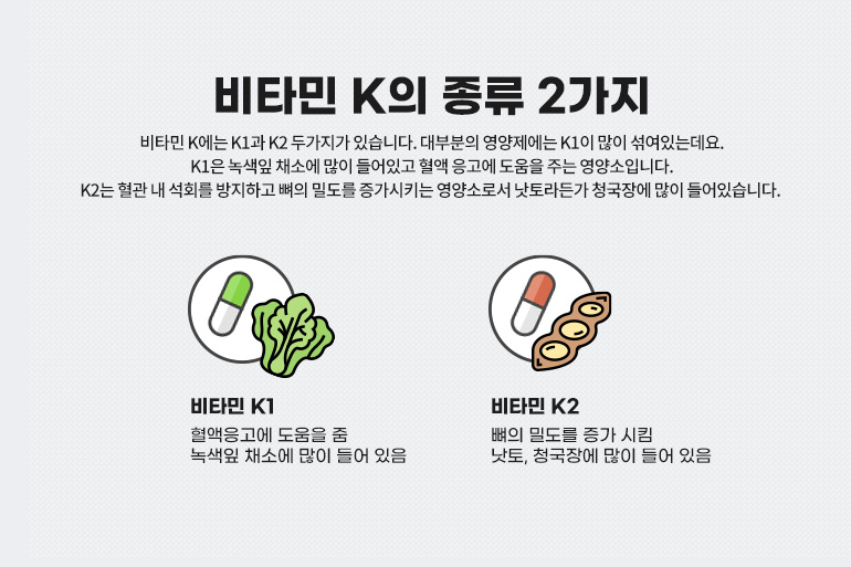 비타민 K에는 K1과 K2 두가지가 있습니다. 대부분의 영양제에는 K1이 많이 섞여있는데요. K1은 녹색잎 채소에 많이 들어있고 혈액 응고에 도움을 주는 영양소입니다. K2는 혈관 내 석회를 방지하고 뼈의 밀도를 증가시키는 영양소로서 낫토라든가 청국장에 많이 들어있습니다.