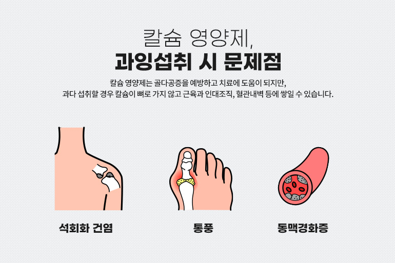 흔히 골다공증 예방을 위해 칼슘 영양제를 먹는 분들이 많이 계신데요. 칼슘 영양제는 골다공증을 예방하고 치료에 도움이 되지만, 과다 섭취할 경우 칼슘이 뼈로 가지 않고 근육과 인대조직, 혈관내벽 등에 쌓일 수 있습니다. 인대에 칼슘이 쌓이게 되면 석회화 건염이 생길 수 있고, 관절 내에 칼슘이 쌓이면 가성 통풍이 생기기도 합니다. 제일 무서운 것은 혈관 벽에 칼슘이 침착되면서 동맥경화증이 더 빨리 생기고 혈관이 막힐 수도 있습니다.