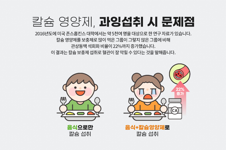 2016년도에 미국 존스홉킨스 대학에서는 약 5천여 명을 대상으로 한 연구 자료가 있습니다. 칼슘 영양제를 보충제로 많이 먹은 그룹이 그렇지 않은 그룹에 비해 관상동맥 석회화 비율이 22%까지 증가했다는 결과가 그것입니다. 이 결과는 칼슘 보충제 섭취로 혈관이 잘 막힐 수 있다는 것을 말해줍니다.