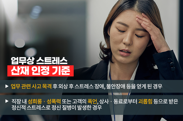 직장인을 대상으로 한 설문에 따르면 직장인 10명 중 9명이 ‘직장 생활로 인해 스트레스를 받고 있다’고 해요. 업무량, 인간관계, 급여, 승진 등 다양한 요인들이 스트레스가 되어 직장인들의 몸과 마음을 힘들게 하고 있죠. 그런데 만약 직장 생활로 인한 스트레스가 쌓이고 쌓여, 심각한 마음의 병으로 이어진다면 우리는 합당한 보상을 받을 수 있을까요? 결코 가볍게 여길 수 없는 직장 내 스트레스! 오늘은 업무 스트레스와 산재처리에 얽힌 다양한 이야기들을 자세히 살펴보도록 해요.