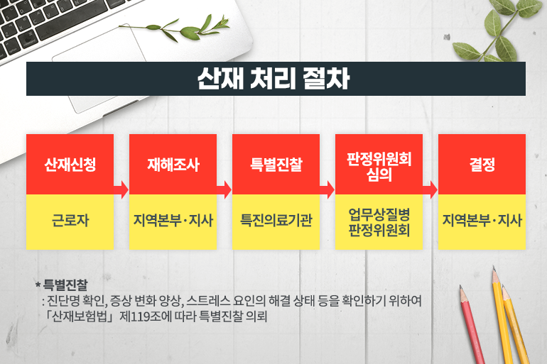 산재가 발생하면 근로자가 우편, 팩스, 산재보험 토탈서비스(https://total.comwel.or.kr), 의료기관 대행 등을 이용해 직접 신청하면 되는데요. 신청 후에는 지역본부, 지사에서 산업재해 조사를 진행하며, 진단명을 확인하거나 스트레스 요인의 해결 상태 등을 점검하기 위해 특진 의료기관에서 특별 진찰을 받는 절차를 거치게 돼요. 이후 업무상 질병 판정위원회의 심의를 거친 후, 지역본부나 지사를 통해 최종 결과를 통보받게 되죠.