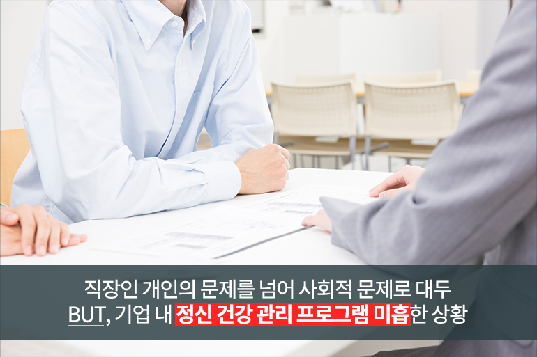 이외에도 성과에 대한 압박, 상사나 고객 등의 갑질, 미래에 대한 불안감, 업무 능력 및 지식의 부족, 낮은 연봉, 힘든 출퇴근길 등 다양한 스트레스 요인들이 있었는데요. 이러한 스트레스로 인해 성격이 예민해졌다거나 만성피로, 소화불량 등에 시달린다는 직장인들의 답변도 많았어요. 뿐만 아니라 불면증, 이유 없는 분노가 생겼다는 응답 비율도 높았죠. 직장인들의 스트레스는 이제 단순히 개인의 문제를 넘어 사회적 문제로 대두되는 상황인데요. 하지만 기업 내에서 정신 건강 관리에 신경 쓰는 경우는 10곳 중 1곳에도 못 미치는 안타까운 현실이랍니다.