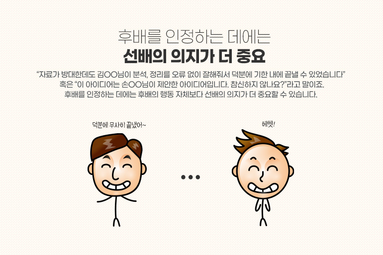 “자료가 방대한데도 김OO님이 분석, 정리를 오류 없이 잘해줘서 덕분에 기한 내에 끝낼 수 있었습니다” 혹은 “이 아이디어는 손OO님이 제안한 아이디어입니다. 참신하지 않나요?”라고 말이죠. 후배를 인정하는 데에는 후배의 행동 자체보다 선배의 의지가 더 중요할 수 있습니다.