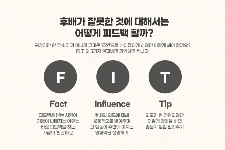 반대로 후배가 잘못한 것에 대해서는 어떻게 피드백해야 할까요? 귀찮기만 한 ‘잔소리’가 아니라 고마운 ‘조언’으로 받아들이게 하려면 어떻게 해야 할까요? F.I.T. 이 3가지 알파벳만 기억하면 됩니다. 먼저 Fact. 피드백을 받는 사람이 기분이 나빠지는 이유는 바로 피드백을 하는 사람의 ‘판단’때문입니다.