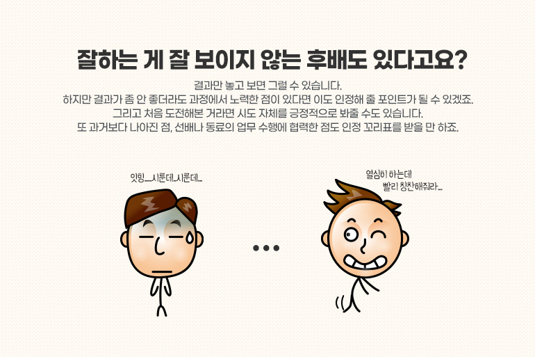 아무리 해도 잘하는 게 잘 보이지 않는 후배도 있다고요? 결과만 놓고 보면 그럴 수 있습니다. 하지만 결과가 좀 안 좋더라도 과정에서 노력한 점이 있다면 이도 인정해 줄 포인트가 될 수 있겠죠. 그리고 처음 도전해본 거라면 시도 자체를 긍정적으로 봐줄 수도 있습니다. 또 과거보다 나아진 점, 선배나 동료의 업무 수행에 협력한 점도 인정 꼬리표를 받을 만 하죠.